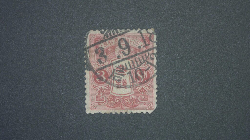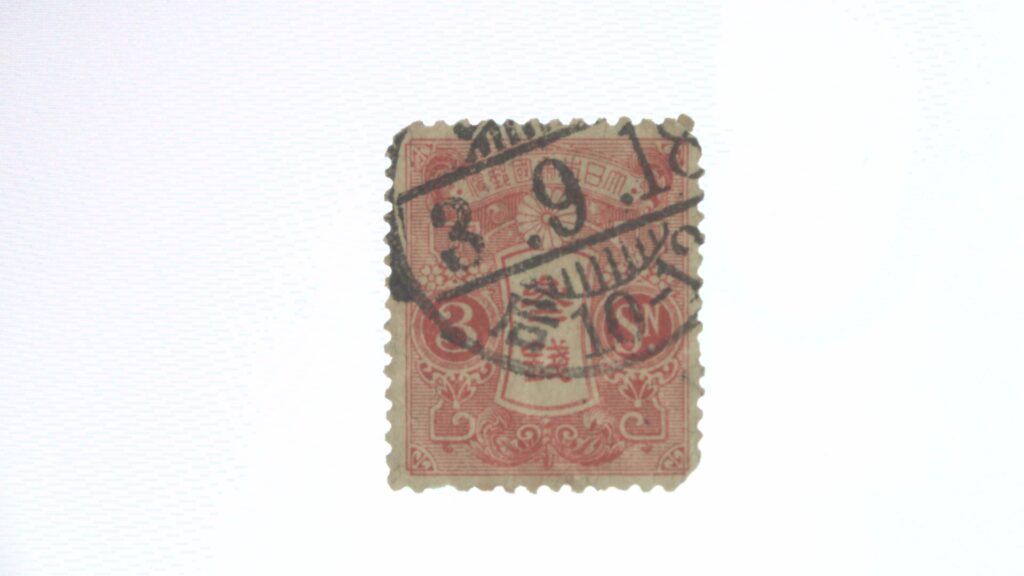 この切手の消印は3.9.18とあるので、大正3年か、昭和3年だと思われる。裏面写真からわかる着色繊維の量は相対的に他の切手よりも明らかに多いので、これらの情報から最初期毛紙だと思われる。