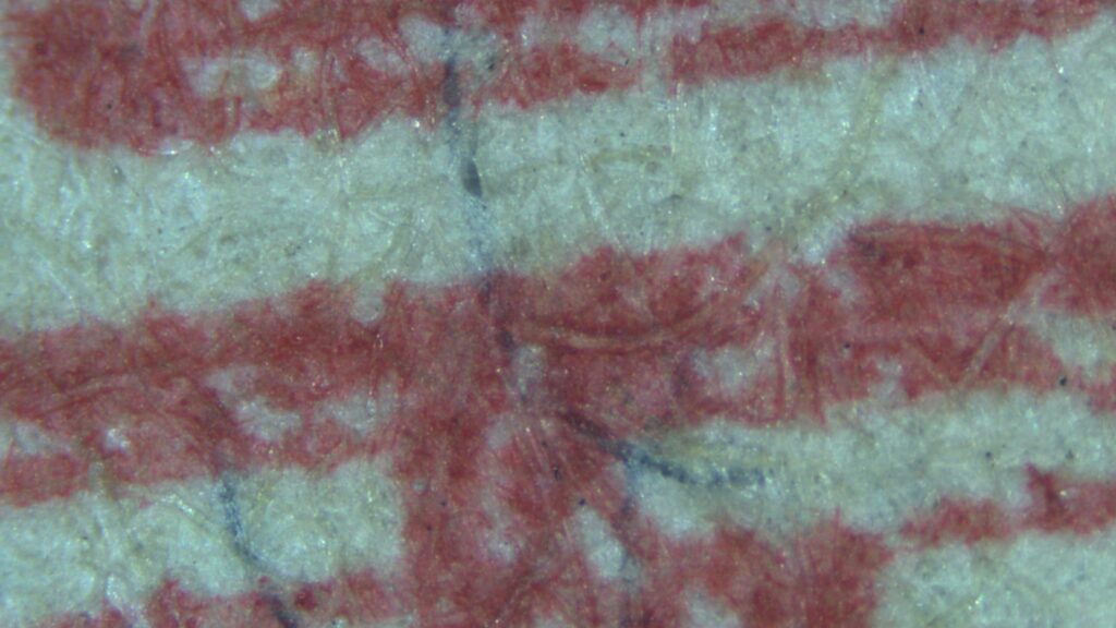 続いて、同じ切手で最高倍率の写真を撮影してみる。撮影した写真は下。表面の滑らかさと目打ちの毛羽立ち具合は評価できそうだ。