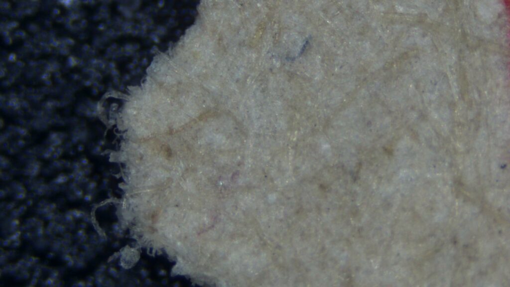 最後に斑点を確認するために透過光の写真を取ってみる。手元に透過光の写真を取る専用の器具はないので、試行錯誤の上で、4K顕微鏡で透過光写真を撮影してみた。この方法で斑点が映るのか、この切手で斑点が確認できるのかはわからないが、この写真には斑点らしきものは写っていない。