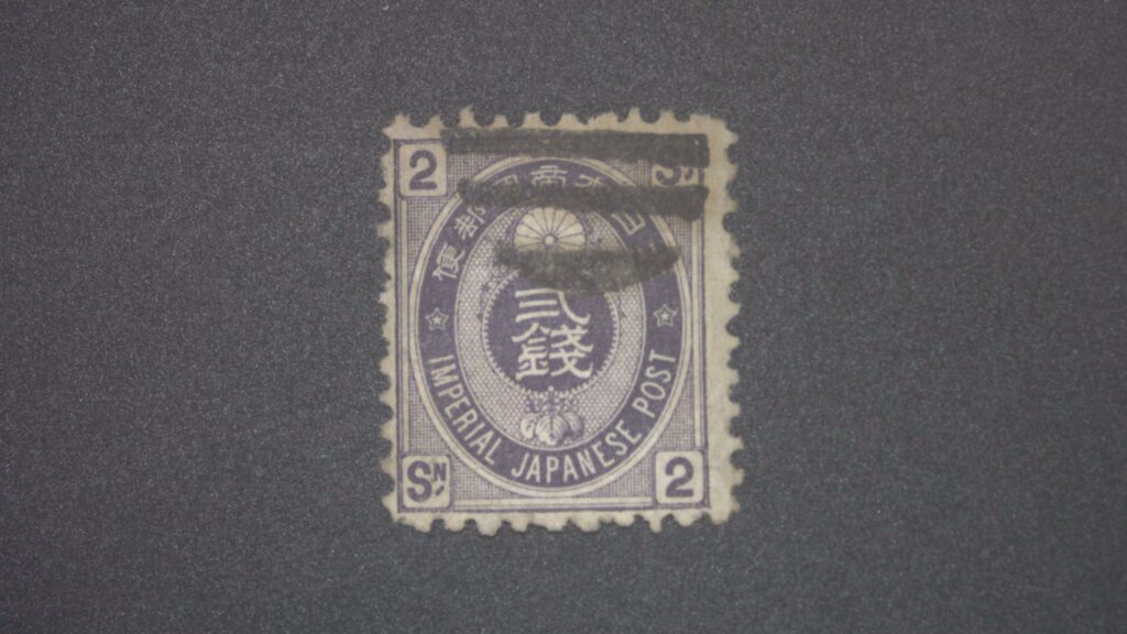 旧小判2銭 青味紫は旧小判2銭 オリーブの後の1879(明治12年)年から、U小判2銭が1883年(明治16年)が発行されるまでのわずか4年間発行されていた切手である。旧小判切手は全体的に入手するのが難しいが、相対的に旧小判2銭 青味紫は比較的入手しやすい方だ。
