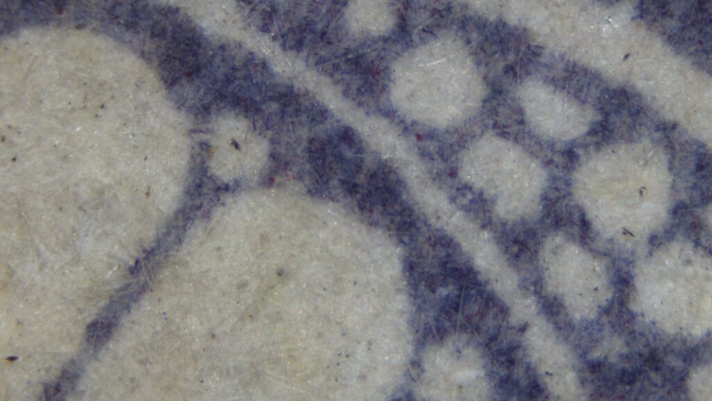 続いて、裏面中央付近の中解像度と高解像度写真を観察した。こちらの写真からは下のことが読み取れた。中解像度でも繊維の全体傾向はわかるけれども、繊維1本1本の追跡は少しむずかしそうだ。できることならば高解像度の写真がほしい。